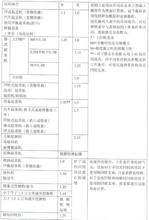 在選擇回轉支承之前,首先確定對該主機應考慮的靜安全系數 fs ,可由表 1 查得。